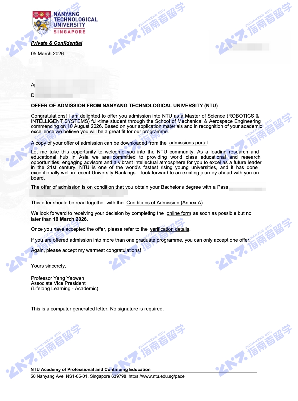 南洋理工大学机器人与智能系统理学硕士研究生offer一枚
