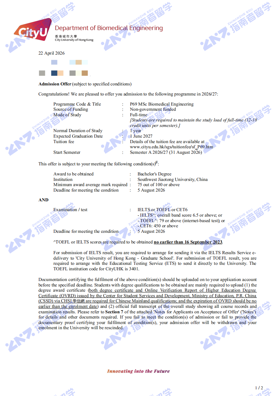 香港城市大学生物医学工程理学硕士研究生offer一枚