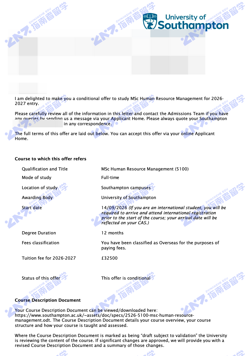 南安普顿大学人力资源管理理学硕士研究生offer一枚