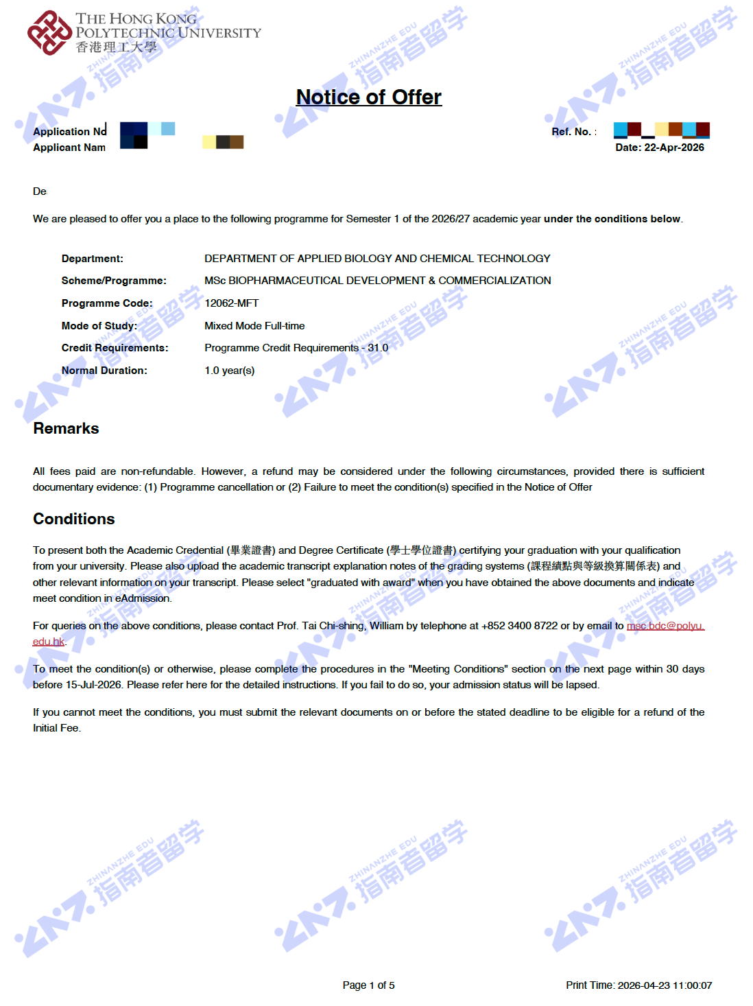 香港理工大学生物医药研发及产业化理学硕士研究生offer一枚