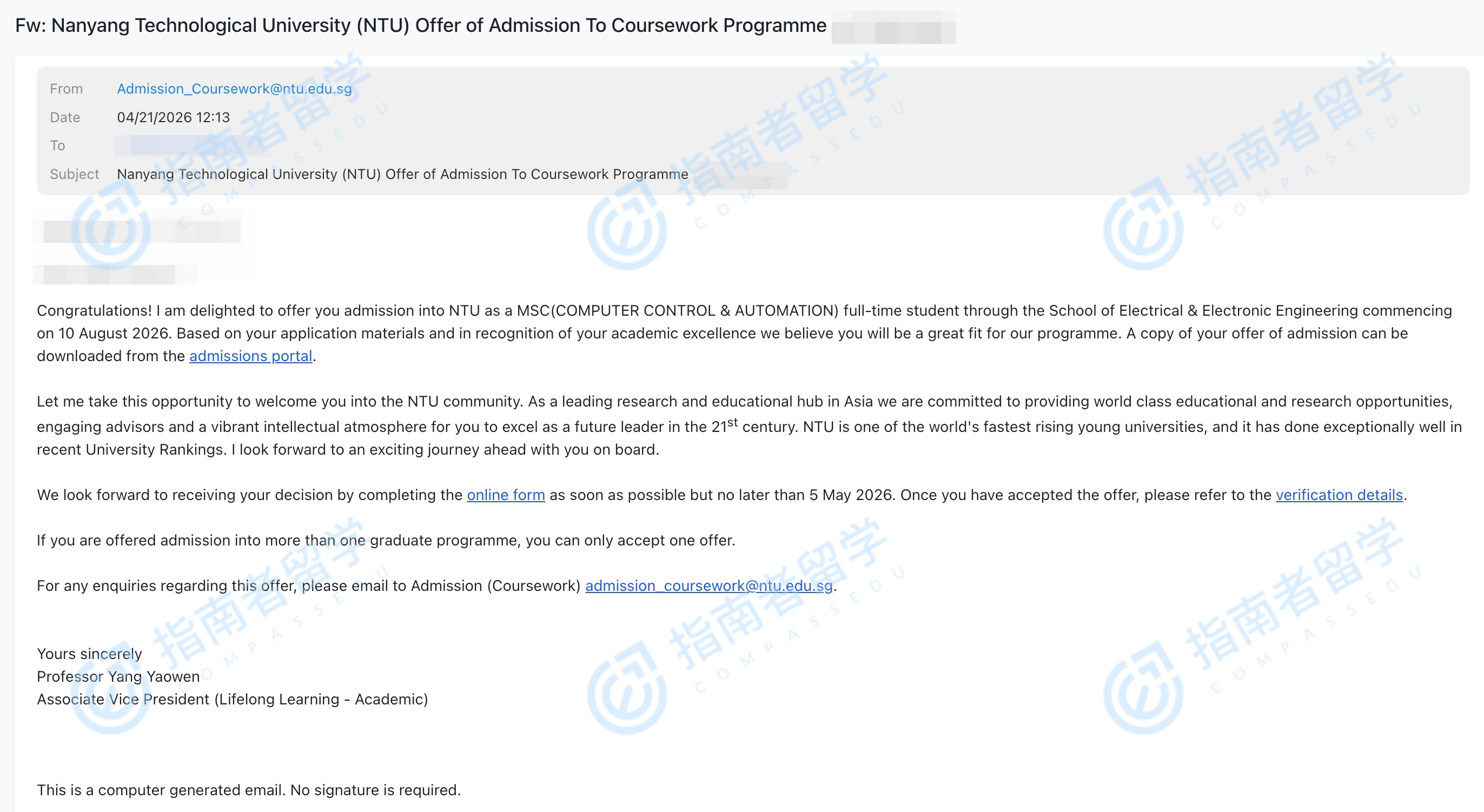南洋理工大学计算机控制与自动化理学硕士研究生offer一枚