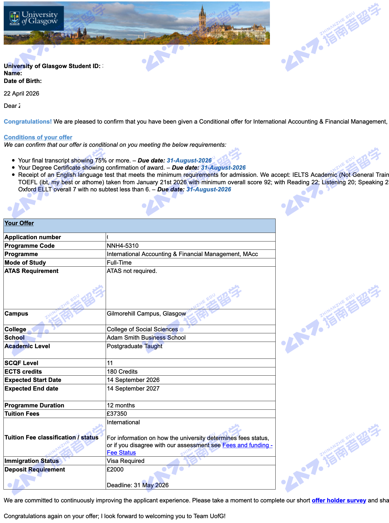 格拉斯哥大学国际会计与财务管理会计学硕士研究生offer一枚