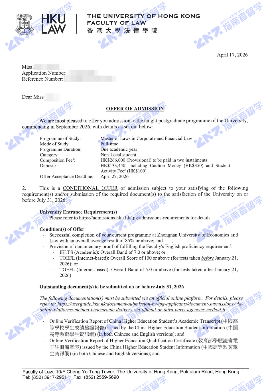 香港大学企业与金融法法学硕士研究生offer一枚