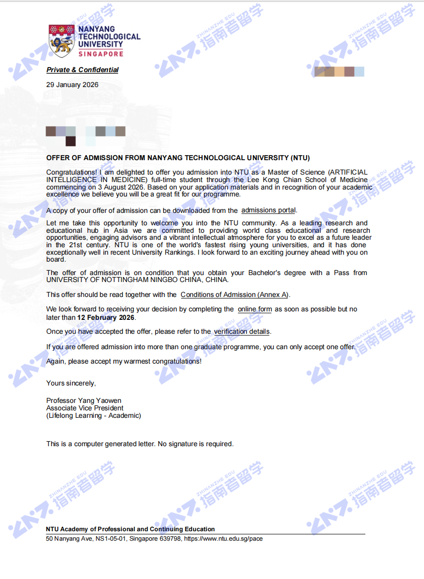 南洋理工大学医学人工智能理学硕士研究生offer一枚