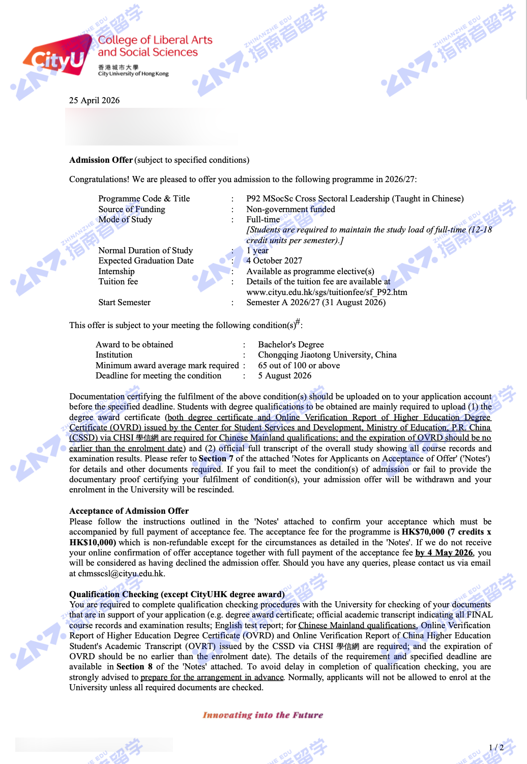 香港城市大学跨界领导学社会科学硕士(中文授课)研究生offer一枚