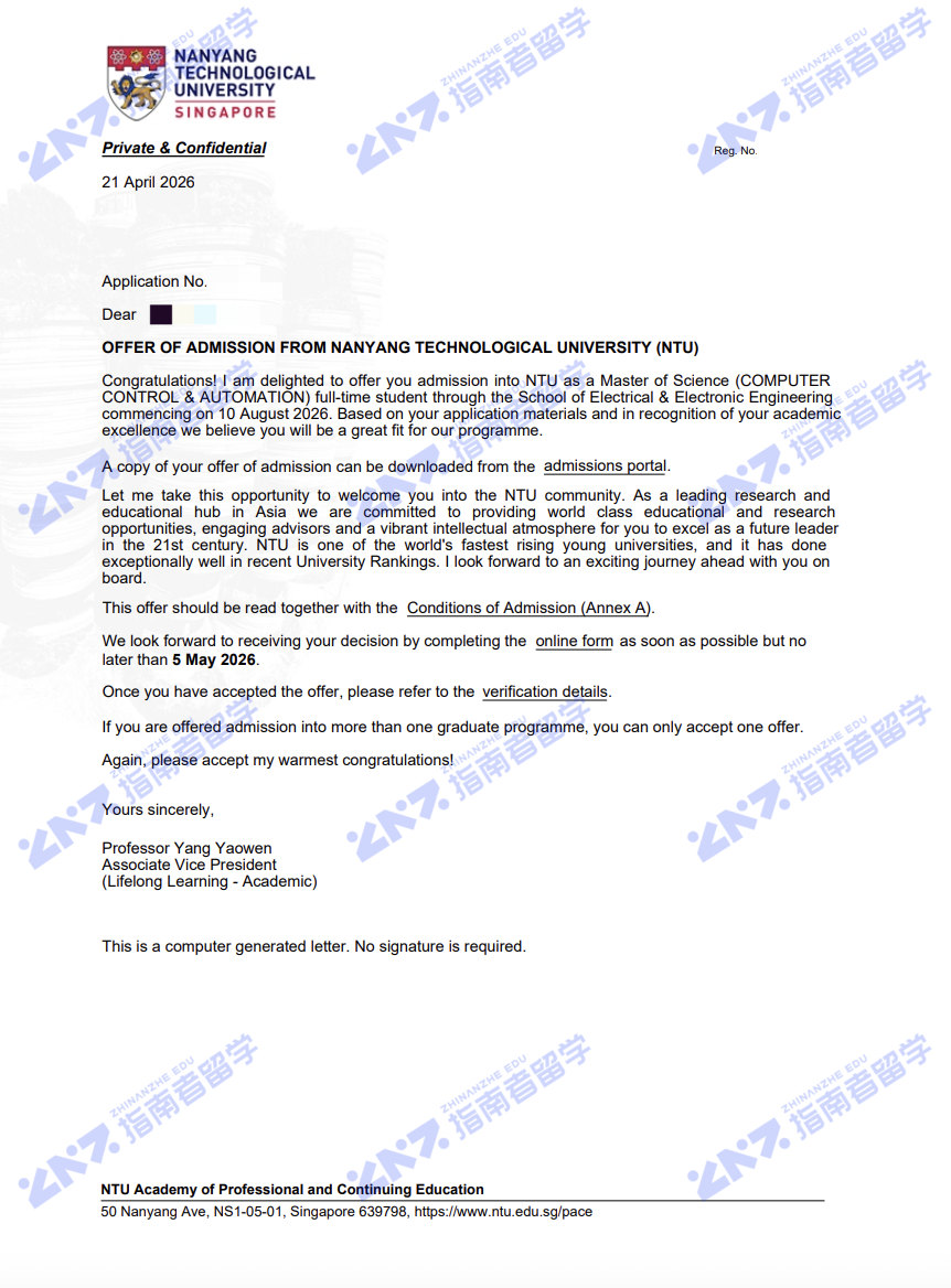 南洋理工大学计算机控制与自动化理学硕士研究生offer一枚