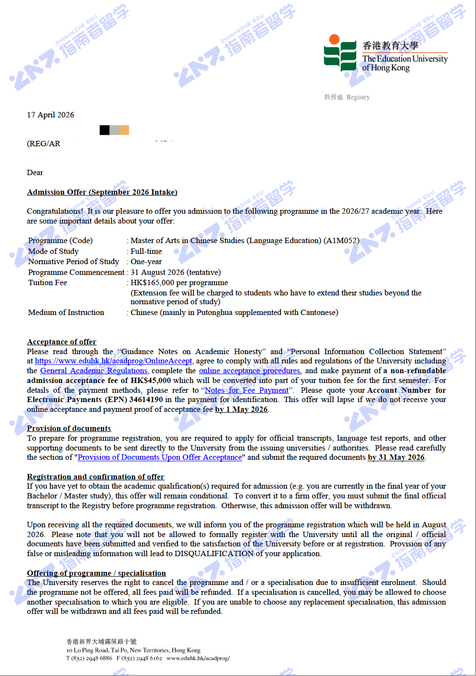 香港教育大学中文研究文学硕士(语文教育)研究生offer一枚