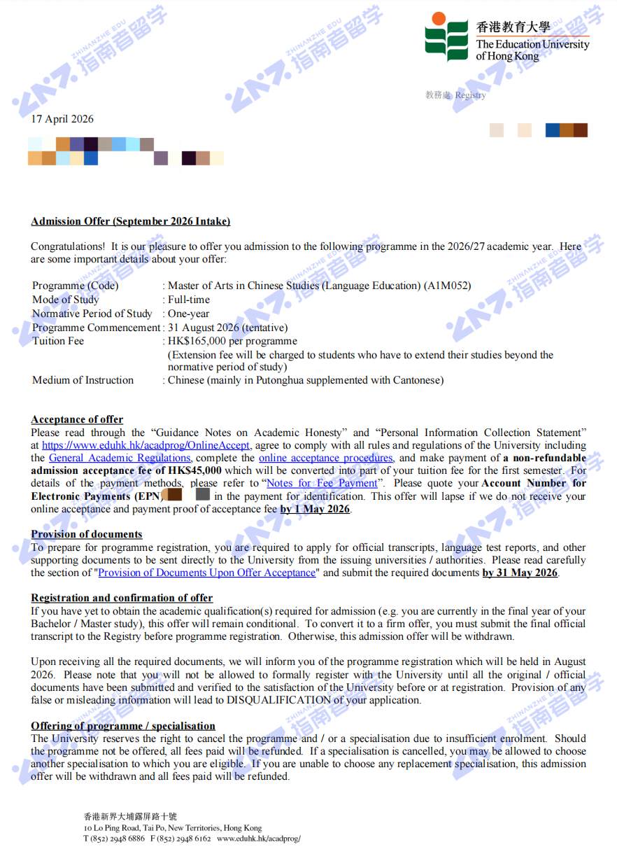 香港教育大学中文研究文学硕士(语文教育)研究生offer一枚