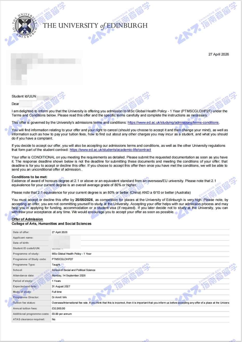 爱丁堡大学全球健康政策理学硕士研究生offer一枚