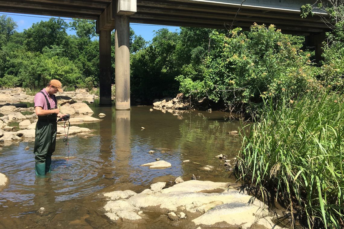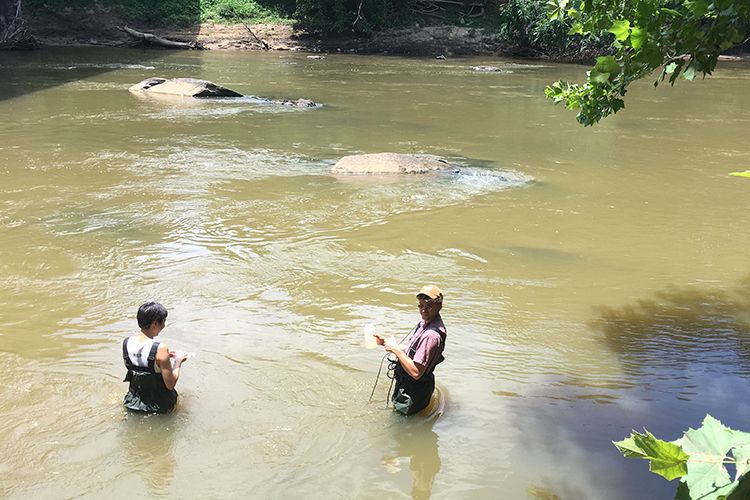 杜克大学的研究人员从皮茨伯勒附近的Haw河中取样。(图片 - 斯台普顿实验室)