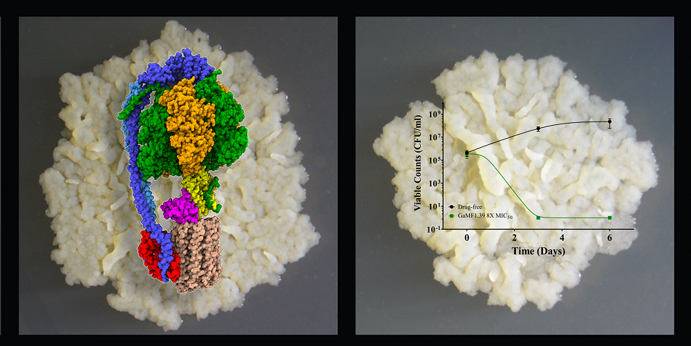 图片:上图显示了两种形式的分枝杆菌菌落形成。分枝杆菌F-ATP合酶(左)是新化合物的靶标,该化合物被证明对杀死细菌有效(右)。