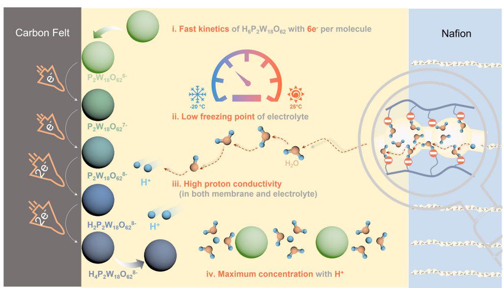 新型HPOM液流电池在低温环境下应用的设计原则,其电解液的特性包括(1)快速的多电子反应; (2)凝固点低至摄氏负35度; (3)高离子电导率及(4)高溶解度。