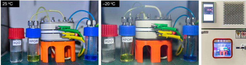 新型HPOM液流电池分别在摄氏25度(左)及冷冻柜内负20度(右)的原型制成品。 旁边的水(H2O)展示作参考用途。