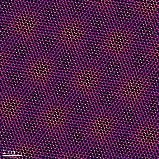 透射电子显微镜图像显示了二碲化钼和二硒化钨的莫尔晶格。