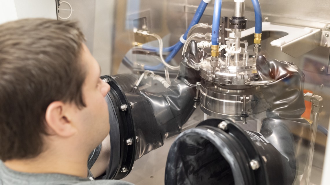 博士生Cameron Gorsak将反应器打开到金属有机化学气相沉积系统,该系统用于制造氧化镓薄膜。