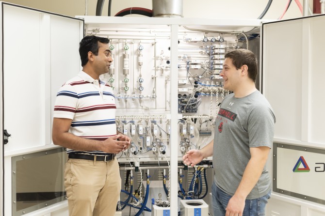 Hari Nair,材料科学与工程助理研究教授(左)和博士生Cameron Gorsak在金属有机化学气相沉积系统前。