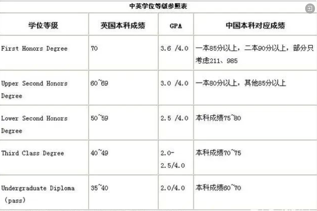就算咱们中国本科毕业没有此类划分,但也是会有相对应的分数档,因为国内同学申请的时候一般还是会提交成绩单、平均分等等,具体的对应水平如下:❶一等学位First honours Degree:英国本科成绩为70分以上,相当于美国GPA的3.8-4.0,国内211重点院校本科平均分85分以上,非211重点院校本科平均分要求88分到90分以上水平。❷二等一(2:1)学位Upper-second class degree:英国本科成绩为60-69分,学位含金量仅次于一等学位,相当于我国一本80分以上,其他院校需要85分以上。不过,随着英国院校申请人数逐渐提升,有的院校对于申请者的均分要求也有所提升,像UCL往年对于2:1学位要求的专业,均分80以上就可以申请,而现在明确指出 2:1学位对应中国均分85,2:2学位对应中国均分80分。❸二等二(2.2)学位Lower-second Class Degree:英国本科成绩50-59分,相当于我国本科成绩75~80分。同时也是大多数院校硕士招生的基础门槛。二等二学位虽然仅次于2:1,但是在大多数英国人和高等教育界眼中,二等二的含金量远没有二等一学位高。❹三等学位Third class degree:英国本科成绩40-49分,刚过及格线的成绩,这个等级想要申请研究生以上等级课程还是比较难的。从英国硕士申请的官网上我们就能看出,英国的学位等级很重要。排名靠前的大学,大部分硕士专业的申请都要求至少2:1学位,学位等级越高越利于就读世界排名越高的学校。对于英国本科毕业的学生,想要申请英国大学的研究生来说,招生官们更喜欢关注学生毕业成绩,尤其是和申请专业相关的专业成绩,而非毕业院校。