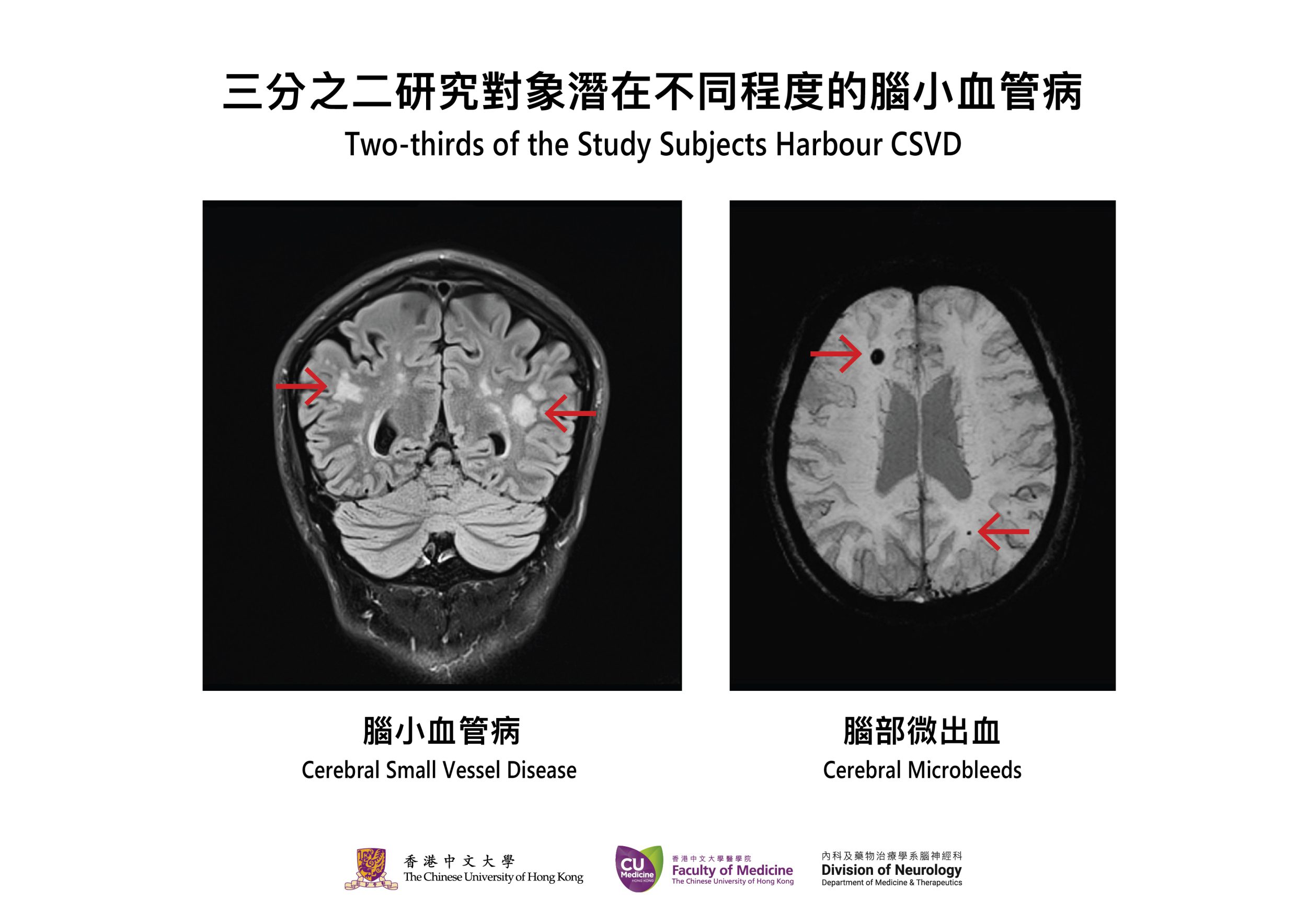 中大医学院内科及药物治疗学系脑神经科是全球最早发现脑小血管病与中风及认知障碍相关的研究团队之一。 脑小血管病目前可透过影像检查发现。 由中大利国伟脑神经学教授、医学院内科及药物治疗学系脑神经科主任及香港脑科学会会长梁慧康教授领导的研究团队,自2019年起为550名来自香港各区不同阶层、年龄介乎40至75岁、并未曾患上任何脑神经疾病的市民进行脑部磁力共振分析,发现当中55%潜藏不带病征的轻度脑小血管病,11% 罹患中度至严重脑小血管病,及22%出现微出血情况。